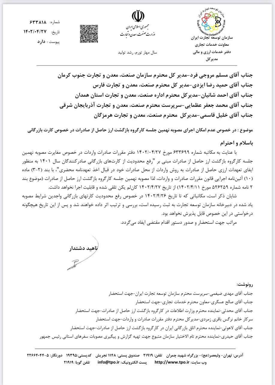 در این بخشنامه آمده است: با عنایت به مکاتبه شماره ۶۳۳۶۹۹ مورخ ۱۴۰۲/۰۴/۲۷ دفتر مقررات صادرات واردات در خصوص مغایرت مصوبه نهمین جلسه کارگروه بازگشت ارز حاصل از صادرات مبنی بر «رفع محدودیت از کارتهای بازرگانی صادرکنندگان سال ۱۴۰۱ به منظور ایفای تعهدات ارزی حاصل از صادرات به روش واردات از محل صادرات خود در قبال اخذ تعهدنامه محضری»، با بند (۲-۳) ماده (۱۰) آئین نامه اجرایی قانون مقررات صادرات و واردات لذا مصوبه نهمین جلسه کارگروه بازگشت ارز حاصل از صادرات موضوع بند ۲ نامه شماره ۵۲۶۲۵۹ مورخ (۱۴۰۲/۴/۱۱ از تاریخ ۱۴۰۲/۴/۲۷ کان لم یکن تلقی شده و قابلیت اجرا نخواهد داشت.